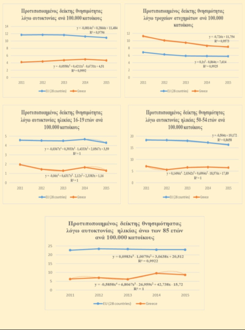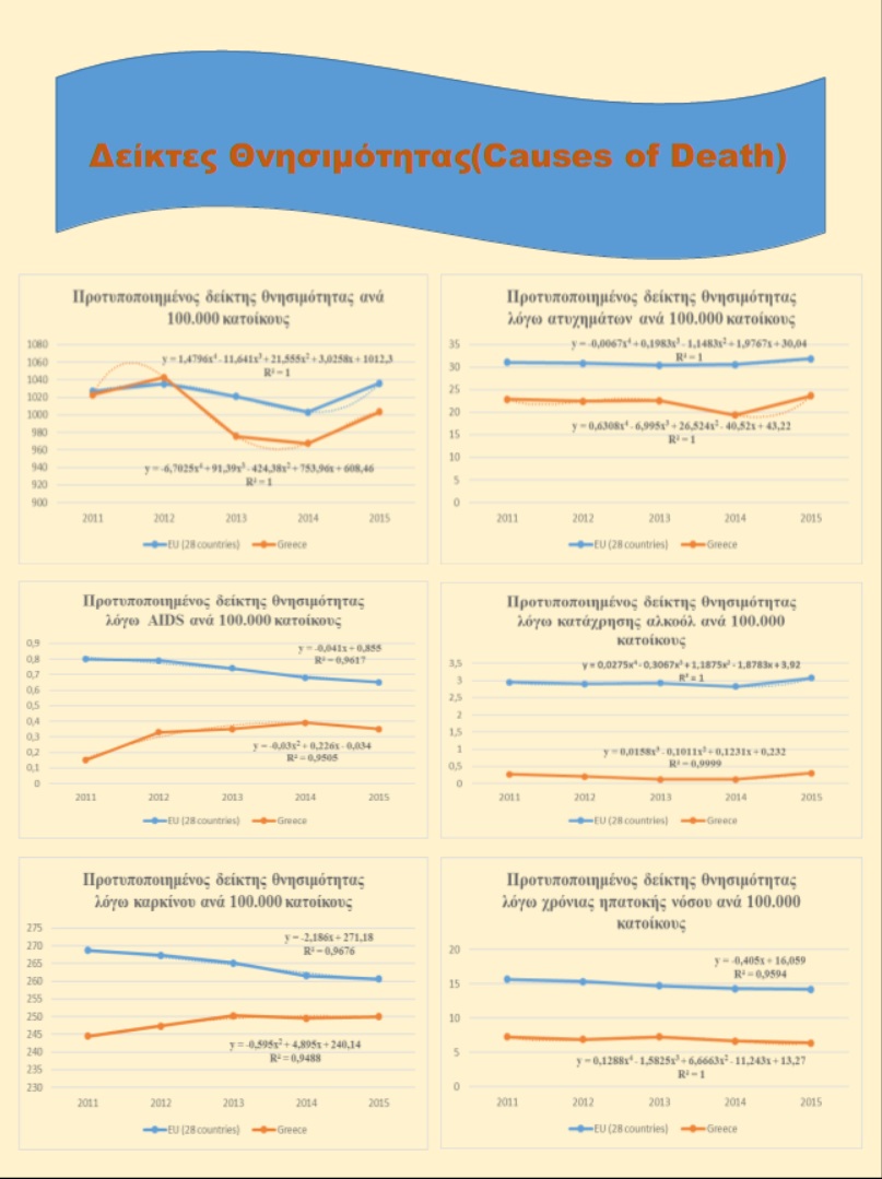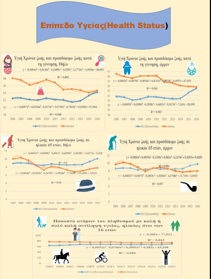 Ξεκινώ με την υγεία παρουσιάζοντας τρεις ενότητες, επίπεδο υγείας-φροντίδα στην υγεία και δείκτες θνησιμότητας. Όλα τα δεδομένα που απεικονίζονται σε διαγράμματα είναι δείκτες προτυποποιημένοι (άρα συγκρίσιμοι αριθμοί) σύμφωνα με τους κανόνες της Ευρωπαϊκής Στατιστικής Υπηρεσίας , γίνεται προβολή της αντίστοιχης εξίσωσης και εμφανίζεται η αντίστοιχη τιμή R-τετράγωνο στο γράφημα. Συγχρόνως παρουσιάζεται η χρονοσειρά που αφορά την Ελληνική πραγματικότητα και η αντίστοιχη που αφορά τις 28 Ευρωπαϊκές χώρες. Τα πρωτογενή δεδομένα που χρησιμοποιήθηκαν είναι από την Eurostat την οποία ιστοσελίδα σας αναφέρω για λόγους εγκυρότητας των δημοσιεύσεων που θα ακολουθήσουν(https://ec.europa.eu/eurostat/data/database). Κάθε δημοσίευση για να θεωρείται έγκυρη και επιστημονικά αποδεκτή πρέπει να αναφέρει την πηγή των δεδομένων που χρησιμοποίησε για την μελέτη της και τα συμπεράσματα της διαφορετικά εξυπηρετεί άλλες σκοπιμότητες.