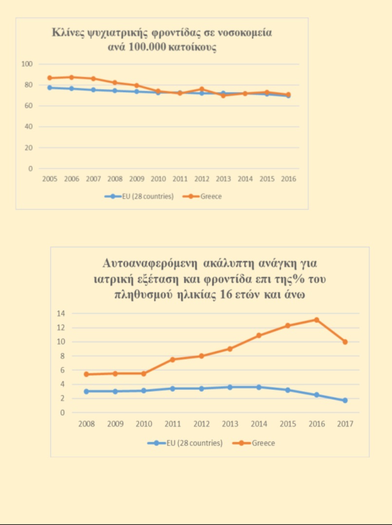 - Στη συνέχεια παρουσιάζονται δείκτες με τον αριθμό των νοσοκομειακών κλινών/100.000 κατοίκους, τον αριθμό των ιατρών/100.000 κατοίκους αλλά και η αυτοαναφερόμενη ανάγκη για ιατρική εξέταση και φροντίδα.