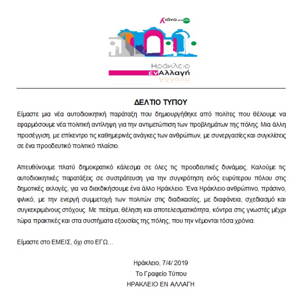 Απευθύνουμε πλατύ δημοκρατικό κάλεσμα σε όλες τις προοδευτικές δυνάμεις. Καλούμε τις αυτοδιοικητικές παρατάξεις σε συστράτευση για την συγκρότηση ενός ευρύτερου πόλου στις δημοτικές εκλογές, για να διεκδικήσουμε ένα άλλο Ηράκλειο. Ένα Ηράκλειο ανθρώπινο, πράσινο, φιλικό, με την ενεργή συμμετοχή των πολιτών στις διαδικασίες, με διαφάνεια, σχεδιασμό και συγκεκριμένους στόχους. Με πείσμα, θέληση και αποτελεσματικότητα, κόντρα στις γνωστές μέχρι τώρα πρακτικές και στα συστήματα εξουσίας της πόλης, που την νέμονται τόσα χρόνια.