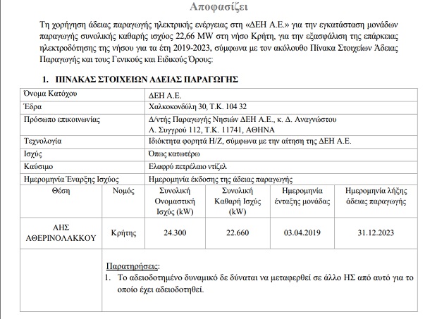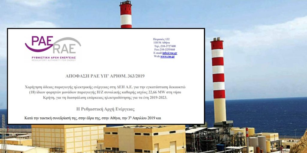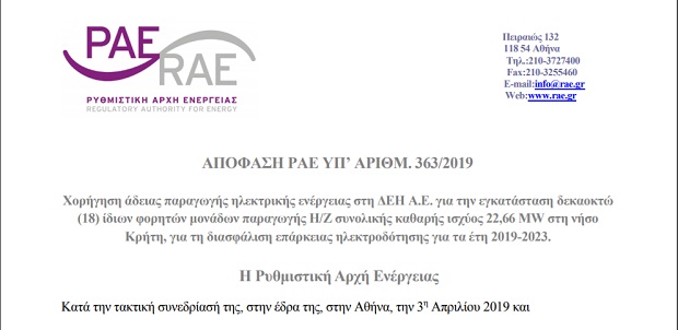 Η ΡΑΕ χορήγησε άδεια παραγωγής ηλεκτρικής ενέργειας στη ΔΕΗ για την εγκατάσταση 18 ίδιων φορητών μονάδων παραγωγής Η/Ζ συνολικής καθαρής ισχύος 22,66 MW στην Κρήτη, για τη διασφάλιση της επάρκειας ηλεκτροδότησης για τα έτη 2019-2023.