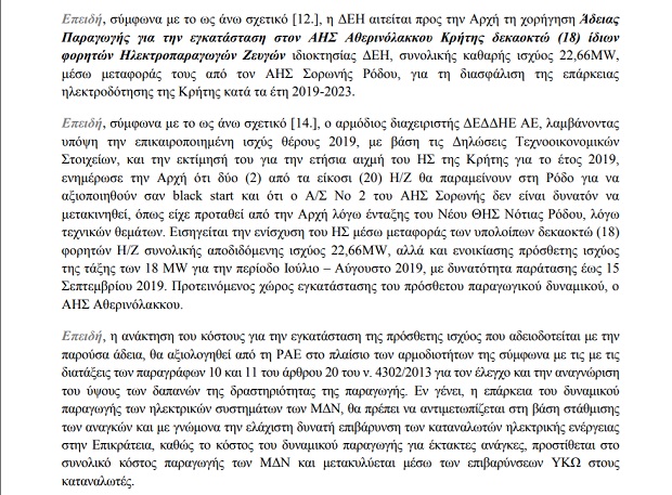 Όπως αναφέρεται στην απόφαση, ο Διαχειριστής ΜΔΝ εκτίμησε το έλλειμμα στο ΗΣ Κρήτης κατά το θέρος του 2019 και 2020 θα είναι περί τα 50MW και 69 MW αντίστοιχα και πρότεινε την ενίσχυση του ΗΣ Κρήτης μέσω της μεταφοράς από τον ΑΗΣ Ρόδου φορητών Η/Ζ συνολικής ισχύος 23MW, του ΑΣ2 ισχύος 20MW και μίσθωσης φορητών Η/Ζ συνολικής ισχύος 3 7MW. Με προτεινόμενη εγκατάσταση του ανωτέρω παραγωγικού δυναμικού στον Υ/Σ 150kV του ΑΗΣ Αθερινόλακκου λόγω ύπαρξης διαθέσιμων ελεύθερων πυλών.