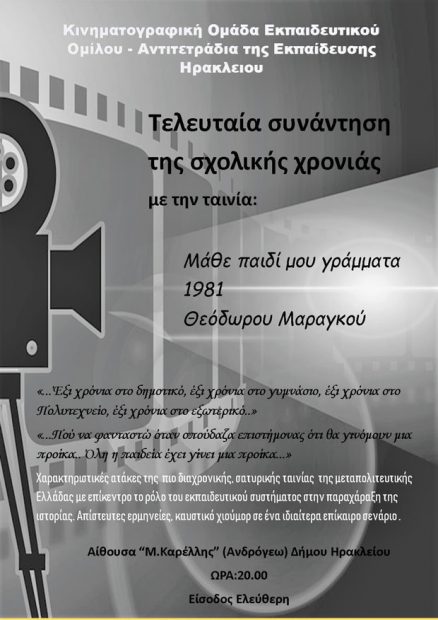Η Κινηματογραφική Ομάδα Εκπαιδευτικού Ομίλου – Αντιτετράδια της Εκπαίδευσης Ηρακλείου, στα πλαίσια της συνέχισης των προβολών που πραγματοποιεί από τις αρχές της σχολικής χρονιάς, σας καλεί την Παρασκευή 12 Απριλίου και ώρα 20.00 στην προβολή της ταινίας “Μάθε παιδί μου γράμματα” που θα πραγματοποιηθεί στην αίθουσα “Μ.Καρέλλης” (Ανδρόγεω, 2ος όροφος). Η είσοδος είναι ελεύθερη.