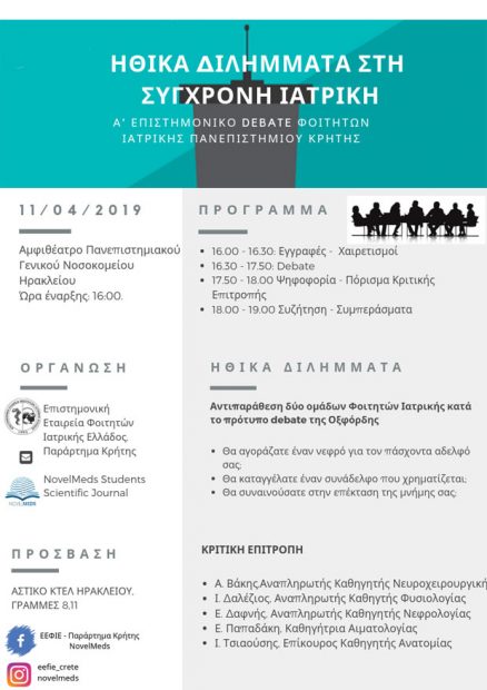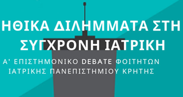 Το Α’ Επιστημονικό Debate Φοιτητών Ιατρικής Πανεπιστημίου Κρήτης θα πραγματοποιηθεί την Πέμπτη 11 Απριλίου 2019 στο αμφιθέατρο του Πανεπιστημιακού Νοσοκομείου Ηρακλείου. Δύο ομάδες φοιτητών Ιατρικής πρόκειται να συζητήσουν κατά το πρότυπο debate της Οξφόρδης ηθικά διλήμματα που απασχολούν τη σύγχρονη Ιατρική κοινότητα. Θα ακολουθήσει ανοιχτή συζήτηση με το κοινό.
