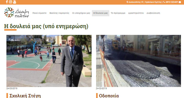 Στον “αέρα” είναι από χθες 10 Απριλίου η νέα ιστοσελίδα της Δύναμης Πολιτών, στην ηλεκτρονική διεύθυνση dypo.gr. Η ιστοσελίδα περιλαμβάνει πληροφορίες γνωριμίας με την παράταξη και με τον Βασίλη Λαμπρινό και πρόκειται να ανανεώνεται συνέχεια με προσθήκες για τους υποψηφίους του συνδυασμού, το δημοτικό έργο, τις προγραμματικές θέσεις και τις προεκλογικές δραστηριότητες της παράταξης του Δημάρχου Ηρακλείου.