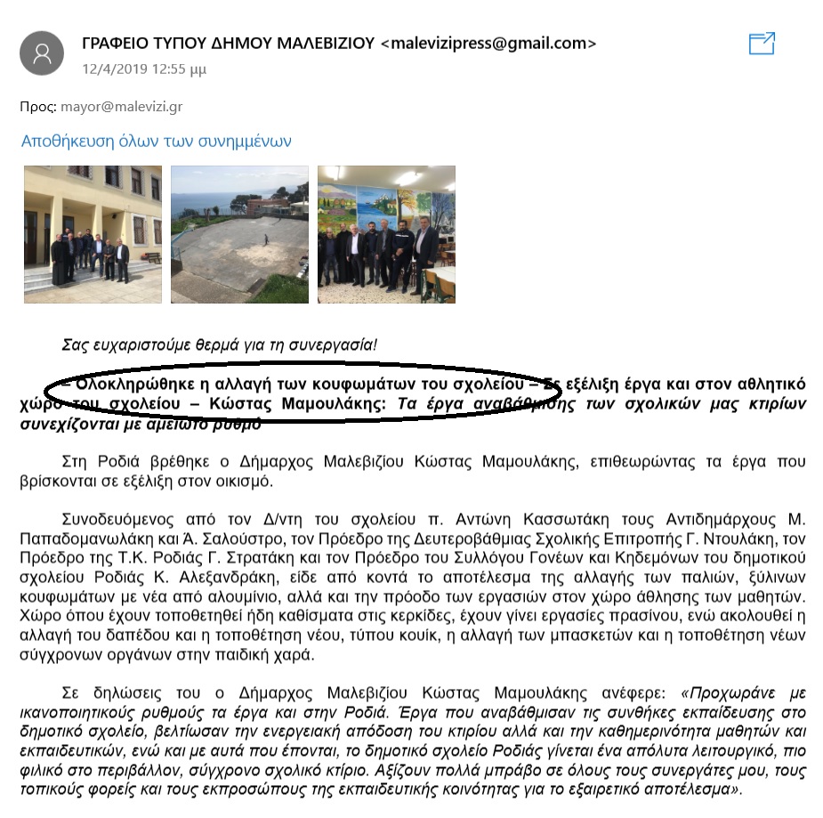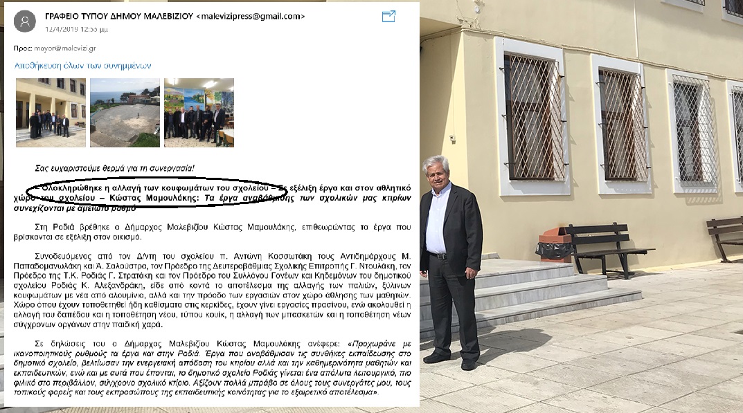 Για παράδειγμα, σε πρόσφατη ανακοίνωσή του αναφερόταν στο… “τεράστιο” έργο της αλλαγής των κουφωμάτων στο δημοτικό σχολείο Ροδιάς, θέλοντας να περάσει στους δημότες του ότι και… κουφώματα αλλάζει!