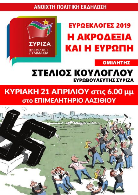 Σε μια σημαδιακή ημερομηνία για την πατρίδα μας και τη δημοκρατία, η Νομαρχιακή Επιτροπή του ΣΥΡΙΖΑ ΛΑΣΙΘΙΟΥ οργανώνει Ανοιχτή Πολιτική Εκδήλωση με τον Ευρωβουλευτή του ΣΥΡΙΖΑ, Δημοσιογράφο Στέλιο Κούλογλου και θέμα “Ακροδεξιά και Ευρώπη”.