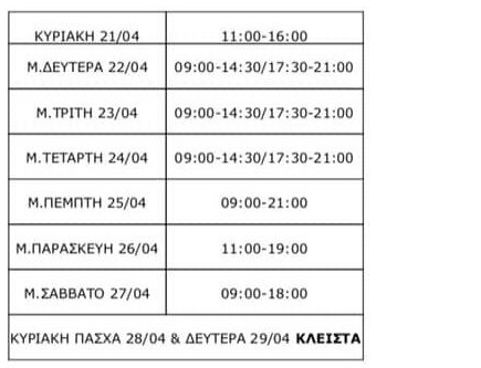 Μ. Δευτέρα: 9.00-14.00 και 17.00-21.00