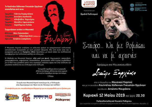 Ο Μουσικός Καρπός θα παρουσιάσει άλλη μία Βραδιά Πολιτισμού στο Ρέθυμνο με μουσικό θέμα: «Σταύρο … Να με θυμάσαι και να μ’ αγαπάς» με τη συνδιοργάνωση της Περιφέρειας Κρήτης & της Περιφερειακής Ενότητας Ρεθύμνου. Η εκδήλωση θα πραγματοποιηθεί στον αύλειο χώρο του Παλαιοντολογικού Μουσείου Ρεθύμνου την Κυριακή 12 Μαΐου και ώρα 20:30 με ελεύθερη είσοδο για τους πολίτες.