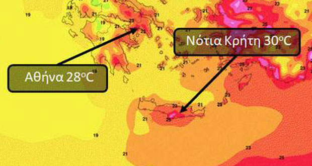 Σε πολλές περιοχές από τον Έβρο έως και την Κρήτη η μέγιστη θερμοκρασία θα ξεπεράσει τους 27 με 28 βαθμούς Κελσίου, όπως φαίνεται και στο χάρτη που ακολουθεί ενώ η απολύτως μέγιστη της ημέρας αναμένεται να σημειωθεί στη Νότια Κρήτη όπου θα φτάσει κατά τόπους τους 30 βαθμούς.