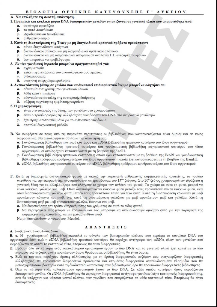 Σήμερα τα προτεινόμενα θέματα στη Βιολογία Θετικής Κατεύθυνσης Γ’ Λυκείου και στα Μαθηματικά Θετικής & Τεχνολογικής Κατεύθυνσης Γ’ Λυκείου.
