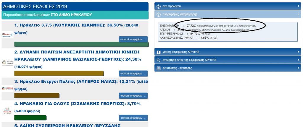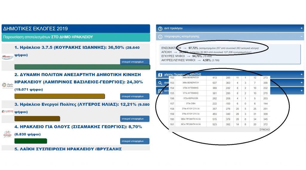 Για παράδειγμα, το αποτέλεσμα στο δήμο Ηρακλείου δεν έχει δοθεί καθώς “κόλλησε” από το απόγευμα της Δευτέρας με εκκρεμότητα σε 6 τμήματα.