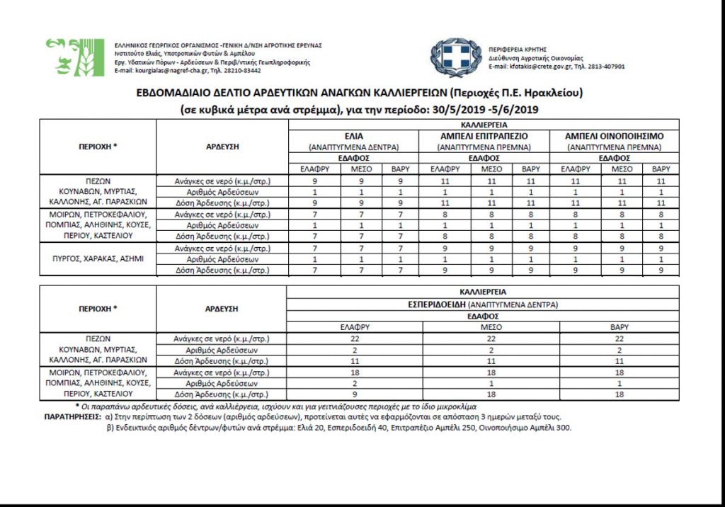 Η Περιφέρεια σε συνεργασία με το Ινστιτούτο Ελιάς Υποτροπικών Φυτών & Αμπέλου του ΕΛΓΟ-Δήμητρα ξεκινώντας από σήμερα θα εκδίδει και φέτος εβδομαδιαία Δελτία Άρδευσης που θα αναφέρονται σε βασικές καλλιέργειες και αντιπροσωπευτικές περιοχές σε όλη την Κρήτη.