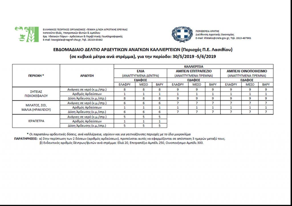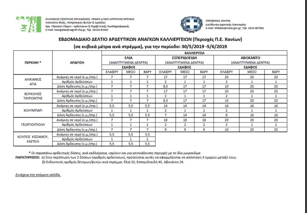 Επίσης υπενθυμίζουμε ότι έχει εκδοθεί Ενημερωτικό Φυλλάδιο Ορθολογικής Χρήσης Νερού Άρδευσης που παρέχονται πληροφορίες και οδηγίες για τις αρδευτικές ανάγκες σε νερό, τα κρίσιμα στάδια ανάπτυξης, καθώς και τις ενδεικτικές τιμές ελλειμματικής άρδευσης για συγκεκριμένες καλλιέργειες της Περιφέρειας Κρήτης, περιλαμβάνοντας την ελιά, την άμπελο, το αβοκάντο και τα εσπεριδοειδή. Επίσης, γίνεται αναφορά στις βασικές αρχές ορθής άρδευσης και στις προτεινόμενες γεωργικές πρακτικές οι οποίες αυξάνουν την αποδοτικότητα του νερού άρδευσης.