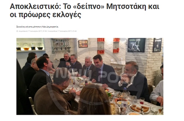 Ενώ το “Παρασκήνιο” στις 18 Ιανουαρίου 2017 έγραφε σε σχόλιο με τίτλο “Δείπνο” Μητσοτάκη με άρωμα πρόωρων …εκλογών