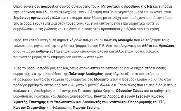 Με δημοσίευμά του το Newpost, στις 17 Ιανουαρίου 2017, αποκάλυπτε ένα “μυστικό” δείπνο του Κυριάκου Μητσοτάκη με μια ομάδα που στελέχωνε την έμπνευσης Αυγενάκη κομματική “ακαδημία στελεχών της ΝΔ”. Ανάμεσα στα επίλεκτα στελέχη της “ακαδημίας” ο πρύτανης του Πανεπιστημίου Κρήτης, ο οποίος, όπως δείχνει η φωτογραφία του Newpost αλλά κάνει αναφορά και το κείμενο, ήταν ανάμεσα στους εκλεκτούς του… μυστικού δείπνου Μητσοτάκη! Και μάλιστα καθήμενος εκ δεξιών του πρόεδρου της ΝΔ!