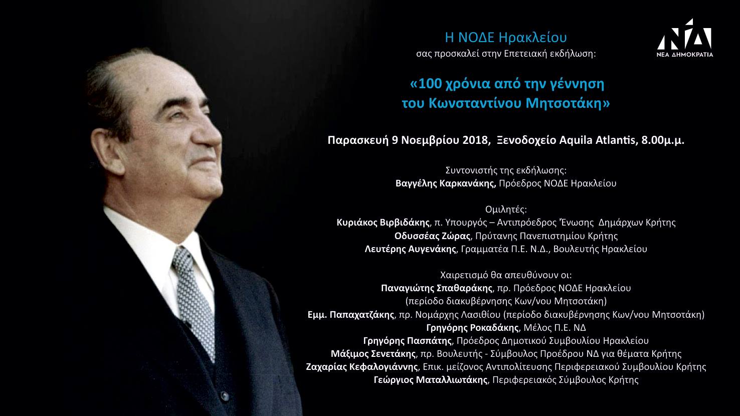 “100 χρόνια από τη γέννηση του μεγάλου πολιτικού ηγέτη Κωνσταντίνου Μητσοτάκη και η ΝΟΔΕ Ηρακλείου προγραμματίζει επετειακή εκδήλωση, την Παρασκευή 9 Νοεμβρίου 2018, στις 8:00 μμ, στο Ξενοδοχείο Aquila Atlantis, στο Ηράκλειο.