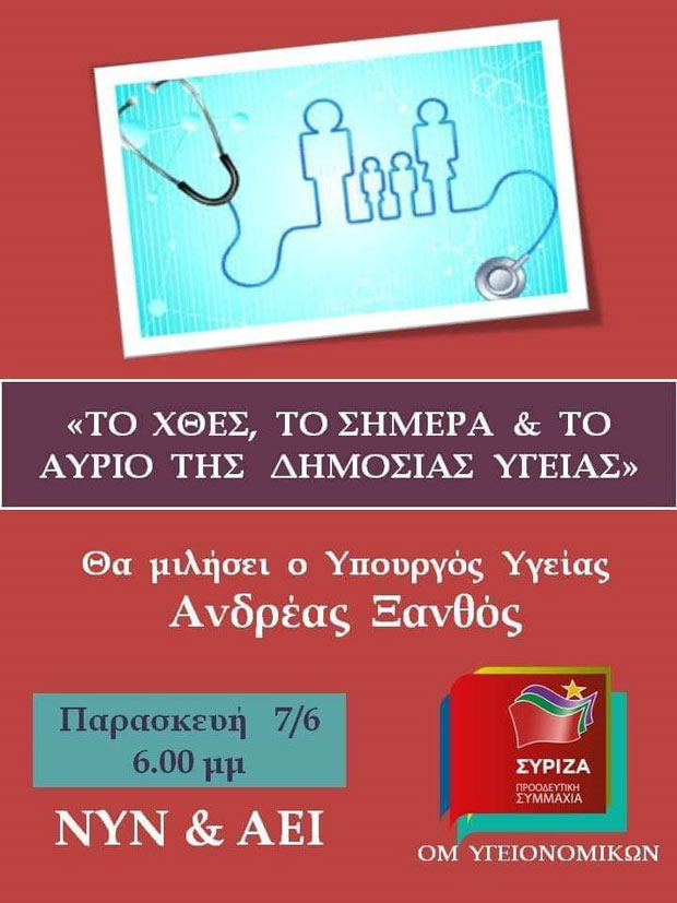 Εκδήλωση διοργανώνουν οι Οργανώνεις Μελών Υγειονομικών Κρήτης του ΣΥ.ΡΙΖ.Α, με θέμα: «Το χθες, το σήμερα και το αύριο της Δημόσιας Υγείας».