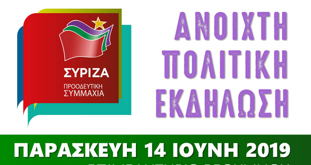 Ο ΣΥΡΙΖΑ-Προοδευτική Συμμαχία διοργανώνει ανοιχτή πολιτική εκδήλωση-συζήτηση στο Ρέθυμνο στις 14/6/2019 στο Επιμελητήριο Ρεθύμνου (Εμμ. Πορτάλιου 23) στις 8 μμ, με ομιλητή τον Υπουργό Υγείας Ανδρέα Ξανθό με θέμα: «Το διακύβευμα των εθνικών εκλογών της 7ης Ιουλίου».