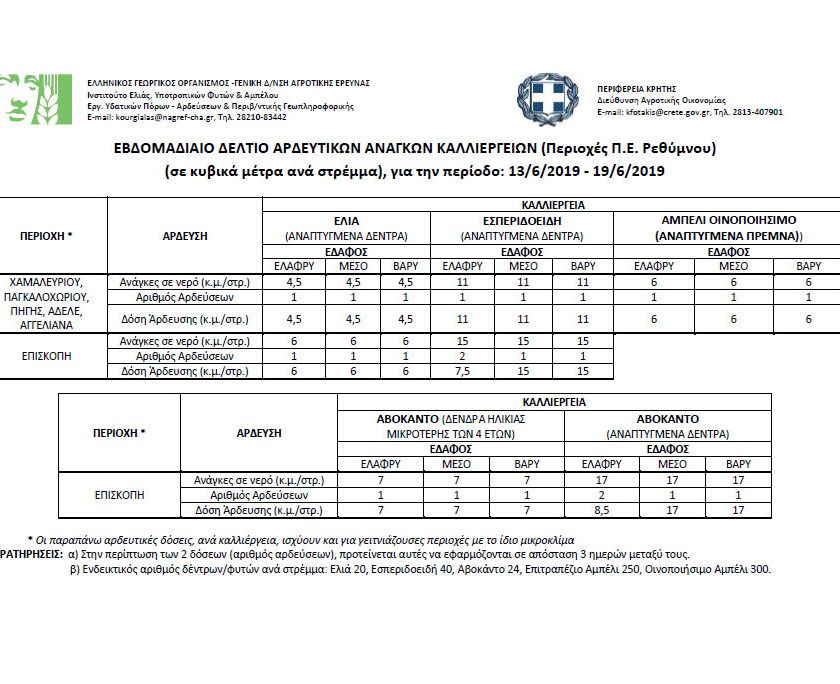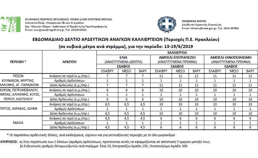 Ανακοίνωση εξέδωσε η Διεύθυνση Αγροτικής Οικονομίας της Περιφέρειας Κρήτης, μέσω της οποίας παρουσιάζει τα αρδευτικά δελτία και των τεσσάρων νομών της Κρήτης για την εβδομάδα από 13/06 έως 19/06/2019.