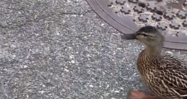 Η μαμά-πάπια περιφερόταν νευρικά γύρω από το φρεάτιο, προσπαθώντας να βρει τρόπο να βοηθήσει τα 10 μικρά της που βρέθηκαν, άγνωστό πως, μέσα σε αυτό. Ανδρες της πυροσβεστικής που βρέθηκαν στο σημείο, πιθανότατα έπειτα από έκκληση κάποιου κατοίκου σήκωσαν τη σιδερένια σχάρα και έβγαλαν ένα, ένα τα παπάκια.