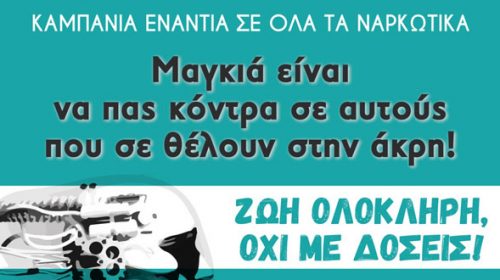Η Τ.Ο. Ρεθύμνου της ΚΝΕ με αφορμή την παγκόσμια ημέρα κατά των ναρκωτικών , διοργανώνει 20-23 Ιουνίου, καμπάνια ενάντια σε όλα τα ναρκωτικά : “ Ζωή ολόκληρη όχι με δόσεις ! Μαγκιά είναι να πας κόντρα σε αυτούς που σε θέλουν στην άκρη”. Στο πλαίσιο της Καμπάνιας έχει προγραμματιστεί πλούσιο πρόγραμμα δραστηριότητας και παρεμβάσεων σε διάφορους χώρους της πόλης του…