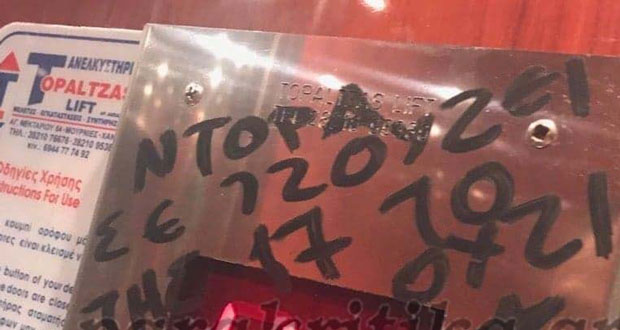 Άγνωστοι βανδάλισαν το ασανσέρ που οδηγεί στο γραφείο της Ντόρας Μπακογιάννη, στο κτίριο που επίσης στεγάζεται η ΝΟΔΕ Χανίων της Νέας Δημοκρατίας στο κέντρο της πόλης.