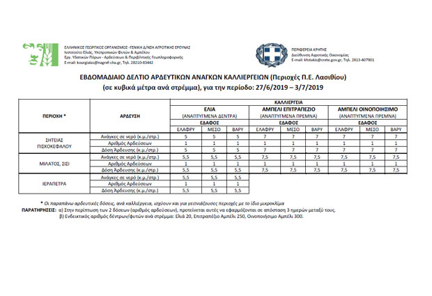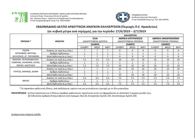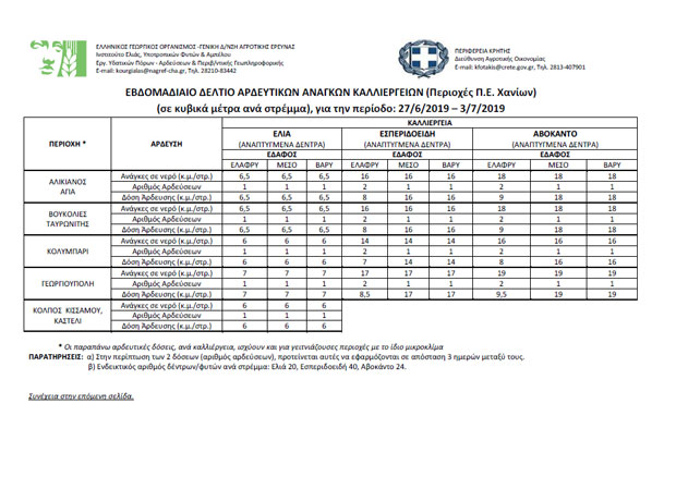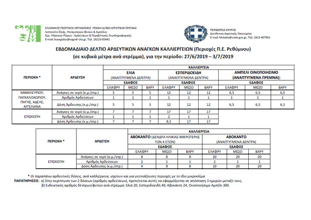 Ανακοίνωση εξέδωσε η Διεύθυνση Αγροτικής Οικονομίας της Περιφέρειας Κρήτης, μέσω της οποίας παρουσιάζει τα αρδευτικά δελτία και των τεσσάρων νομών της Κρήτης για την εβδομάδα από 27/06 έως 03/07/2019.