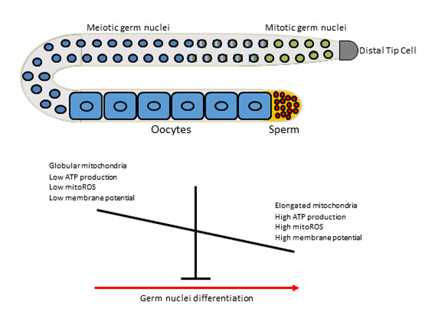Σε αντίθεση με τα σωματικά κύτταρα, τα βλαστοκύτταρα είναι πρακτικά αθάνατα και, μεταξύ άλλων, ως κύτταρα του αναπαραγωγικού συστήματος, εκπληρώνουν ένα σημαντικό ρόλο, την αξιόπιστη μεταφορά του γενετικού υλικού (DNA) στο διηνεκές. Πρόσφατη έρευνα στο Ινστιτούτο Μοριακής Βιολογίας και Βιοτεχνολογίας (ΙΜΒΒ) του Ιδρύματος Τεχνολογίας και Έρευνας (ΙΤΕ), τα αποτελέσματα της οποίας δημοσιεύονται στο έγκριτο διεθνές επιστημονικό περιοδικό Cell Death and Differentiation (Nature Press), συνδέει τη μιτοχονδριακή λειτουργία και ενεργότητα με τη διαφοροποίηση των βλαστικών κυττάρων στο νηματώδη Caenorhabditis elegans. Τα μιτοχόνδρια είναι κυτταρικά οργανίδια που επιτελούν κρίσιμες λειτουργίες, με γνωστότερη την παραγωγή ενέργειας στα ευκαρυωτικά κύτταρα.