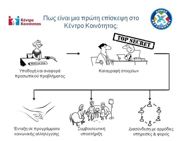 Αφού έγινε ξενάγηση στους χώρους, έγινε αναλυτική ενημέρωση για τη μέχρι σήμερα λειτουργία της νεοσύστατης δομής. Ο δήμαρχος αναφέρθηκε στο προφίλ του Δήμου Χερσονήσου και η παρουσίαση για τις αρμοδιότητες και δράσεις του Κέντρου Κοινότητας συνεχίστηκε από τα στελέχη του Κέντρου Κοινότητας. Η συνάντηση ολοκληρώθηκε με γόνιμη συζήτηση με όλους τους παρευρισκόμενους για το ρόλο και την προσφορά της νέας κοινωνικής δομής, η οποία συγχρηματοδοτείται από το ΕΚΤ, στις ευάλωτες κοινωνικές ομάδες του Δήμου. Οι επίσημοι επισκέπτες έμειναν απόλυτα ικανοποιημένοι και διατύπωσαν ιδιαιτέρως θετικά σχόλια για τη συνέχιση της επιτυχημένης λειτουργίας του Κέντρου Κοινότητας Δήμου Χερσονήσου.