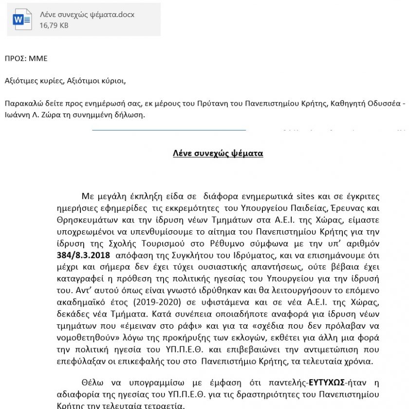 Με μεγάλη έκπληξη είδα σε διάφορα ενημερωτικά sites και σε έγκριτες ημερήσιες εφημερίδες τις εκκρεμότητες του Υπουργείου Παιδείας, Έρευνας και Θρησκευμάτων και την ίδρυση νέων Τμημάτων στα Α.Ε.Ι. της Χώρας, είμαστε υποχρεωμένοι να υπενθυμίσουμε το αίτημα του Πανεπιστημίου Κρήτης για την ίδρυση της Σχολής Τουρισμού στο Ρέθυμνο σύμφωνα με την υπ’ αριθμόν 384/8.3.2018 απόφαση της Συγκλήτου του Ιδρύματος, και να επισημάνουμε ότι μέχρι και σήμερα δεν έχει τύχει ουσιαστικής απαντήσεως, ούτε βέβαια έχει καταγραφεί η πρόθεση της πολιτικής ηγεσίας του Υπουργείου για την ίδρυσή του. Αντ’ αυτού όπως είναι γνωστό ιδρύθηκαν και θα λειτουργήσουν το επόμενο ακαδημαϊκό έτος (2019-2020) σε υφιστάμενα και σε νέα Α.Ε.Ι. της Χώρας, δεκάδες νέα Τμήματα. Κατά συνέπεια οποιαδήποτε αναφορά για ίδρυση νέων τμημάτων που «έμειναν στο ράφι» και για τα «σχέδια που δεν πρόλαβαν να νομοθετηθούν» λόγω της προκήρυξης των εκλογών, εκθέτει για άλλη μια φορά την πολιτική ηγεσία του ΥΠ.Π.Ε.Θ. και επιβεβαιώνει την αντιμετώπιση που επεφύλαξαν οι επικεφαλής του στο Πανεπιστήμιο Κρήτης, τα τελευταία χρόνια.