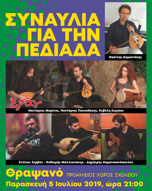 Συναυλία στήριξης που διοργανώνει η Πρωτοβουλία πολιτών για την διάσωση, προβολή και αειφόρο ανάπτυξη της Πεδιάδος την Παρασκευή 5 Ιουλίου 2019 και ώρα 21:00′, στον προαύλιο χώρο του Σχολείου, στο Θραψανό.