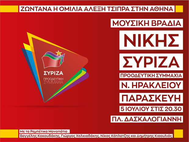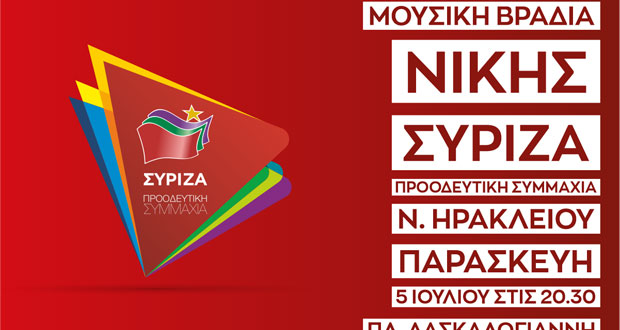 Κάλεσμα για συμμετοχή σε μουσική βραδιά που διοργανώνει στο εκλογικό του κέντρο στην Πλατεία Δασκαλογιάννη, εξέδωσε ο ΣΥΡΙΖΑ Ηρακλείου.