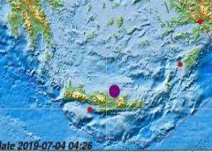 | Distances | 316 km SE of Athens, Greece / pop: 730,000 / local time: 07:01:32.2 2019-07-04 17 km NE of Irákleion, Greece / pop: 138,000 / local time: 07:01:32.2 2019-07-04 |