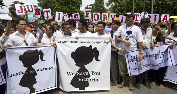 Οι διαδηλωτές συγκεντρώθηκαν έξω από τα γραφεία της Εγκληματολογικής Υπηρεσίας στην Γιανγκόν, φορώντας λευκά μπλουζάκια που έγραφαν «Δικαιοσύνη για τη Βικτόρια» ή «Δεν θέλουμε άλλη Βικτόρια», όπου «Βικτόρια» το ψευδώνυμο του μικρού κοριτσιού που έπεσε θύμα βιασμού.
