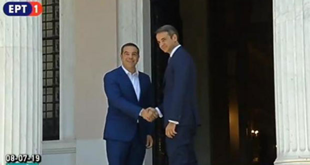 Αμέσως μετά την ορκωμοσία του στο Προεδρικό Μέγαρο ο κ. Μητσοτάκης κατευθύνθηκε στο Μέγαρο Μαξίμου, όπου τον περίμενε στην κορυφή της σκάλας ο απελθών πρωθυπουργός, Αλέξης Τσίπρας. Ο κ. Μητσοτάκης ανέβηκε με ταχύ βήμα, αντάλλαξε σύντομη χειραψία για τους φωτογράφους με τον Αλέξη Τσίπρα και στην συνέχεια ο κ. Τσίπρας τον συνόδευσε στο εσωτερικό του Μεγάρου Μαξίμου. Είναι μία διαδικασία που όπως επισήμανε χθες ο κ. Τσίπρας δεν είχε ακολουθηθεί το 2015 όταν έγινε εκείνος πρωθυπουργός αλλά δεν του παρέδωσε το Μαξίμου ο τότε προκάτοχός του.
