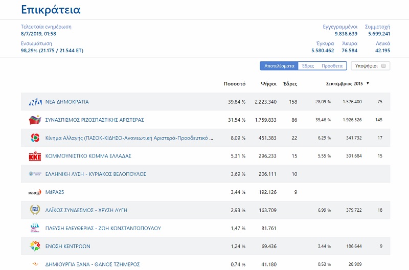 Το αποτέλεσμα της Επικράτειας στο 98,3%: ΝΔ 39,84%- ΣΥΡΙΖΑ 31,54% 8 Ιουλίου 20198 Ιουλίου 2019 Το αποτέλεσμα της Επικράτειας στις 2 πμ, με καταμετρημένο πάνω από το 98%, η ΝΔ συγκεντρώνει 39,84% και ο ΣΥΡΙΖΑ 31,54%.