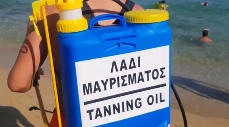 Ο άνδρας κυκλοφορεί στην πλάτη με ένα ψεκαστήρι με λάδι μαυρίσματος, που φτιάχνει η θεία του στη Θεσσαλονίκη και το οποίο περιέχει καρυδέλαιο, καροτέλαιο, άρωμα, λάδι καρύδας και ηλιέλαιο.
