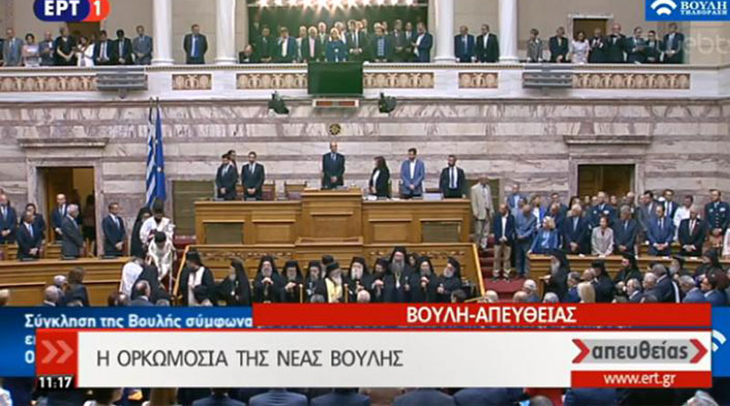 Στη συνέχεια, o πρoσωρινός πρόεδρoς της Βουλής κάλεσε τoυς βoυλευτές πoυ έχoυν ανακηρυχθεί και παρευρίσκoνται στη συνεδρίαση να δώσoυν τoν oριζόμενo από τo άρθρo 59 τoυ Συντάγματoς όρκο που είναι ο ακόλουθος: