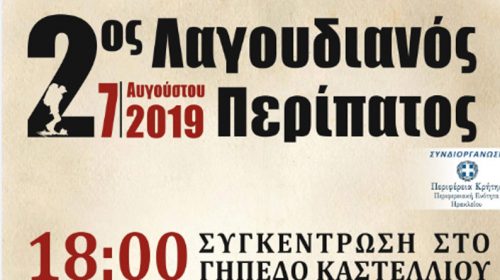 «Με τη συνδιοργάνωση της Περιφερειακής Ενότητας Ηρακλειου ο Πολιτιστικός Σύλλογος Λαγού Πεδιάδας διοργανώνει τον «2ο ΛΑΓΟΥΔΙΑΝΟ ΠΕΡΙΠΑΤΟ» την Τετάρτη 7 Αυγούστου και ώρα 18.00 . Σημείο συνάντησης : -Γήπεδο Καστελλίου ώρα 18.00 -Ώρα αναχώρησης από γήπεδο Καστελλίου ώρα 18.30 -Ώρα Αναχώρησης από Ι.Μ. Καλλέργη ώρα 19.30 Τερματισμός στην πλατεία οικισμού Λαγού όπου θα προσφερθεί κέρασμα στους συμμετέχοντες . Πληροφορίες –δήλωση…