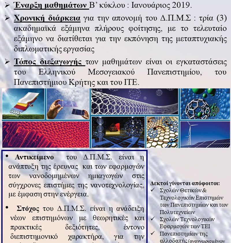 Τα τμήματα Ηλεκτρολόγων Μηχανικών & Μηχανικών Υπολογιστών και Ηλεκτρονικών Μηχανικών του Ελληνικού Μεσογειακού Πανεπιστημίου, τα τμήματα Χημείας και Επιστήμης & Τεχνολογίας Υλικών του Πανεπιστημίου Κρήτης, και το Ινστιτούτο Ηλεκτρονικής Δομής και Λέιζερ του Ιδρύματος Τεχνολογίας και Έρευνας προσκαλούν σε εκδήλωση ενδιαφέροντος και υποβολή αιτήσεων για τον Δι-ιδρυματικό Πρόγραμμα Μεταπτυχιακών Σπουδών (Δ.Π.Μ.Σ.) «Νανοτεχνολογία για Ενεργειακές Εφαρμογές – Nanotechnology for Energy Applications».
