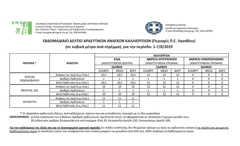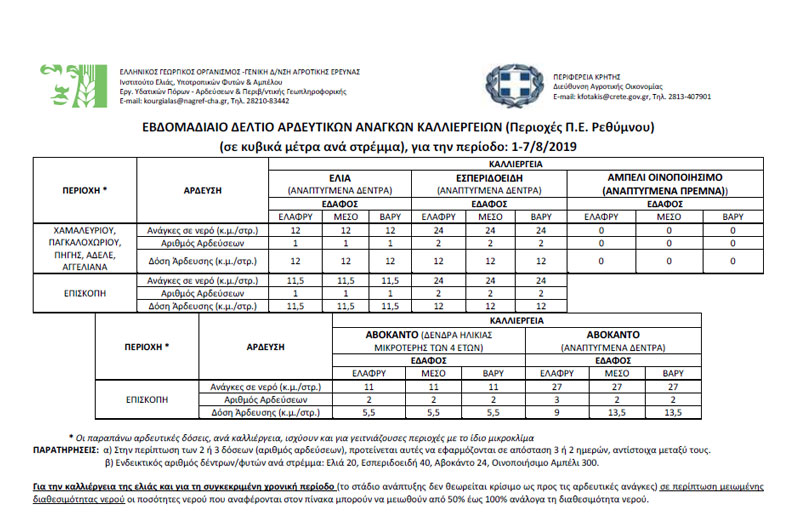 Ανακοίνωση εξέδωσε η Διεύθυνση Αγροτικής Οικονομίας της Περιφέρειας Κρήτης, μέσω της οποίας παρουσιάζει τα αρδευτικά δελτία και των τεσσάρων νομών της Κρήτης για την εβδομάδα από 1 έως 7 Αυγούστου 2019.