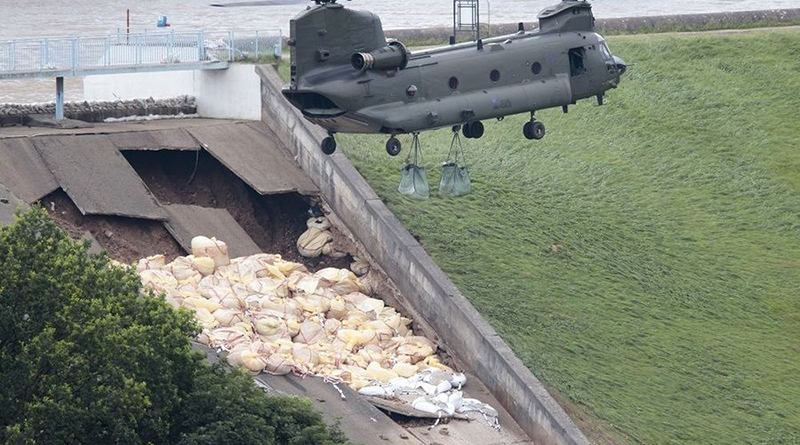Ελικόπτερο της πολεμικής αεροπορίας της Βρετανίας έριξε σήμερα σακιά με αμμοχάλικο στην εξωτερική πλευρά ενός φράγματος, προσπαθώντας να αποτρέψει την κατάρρευσή του, με αποτέλεσμα να πλημμυρίσει η παρακείμενη πόλη.