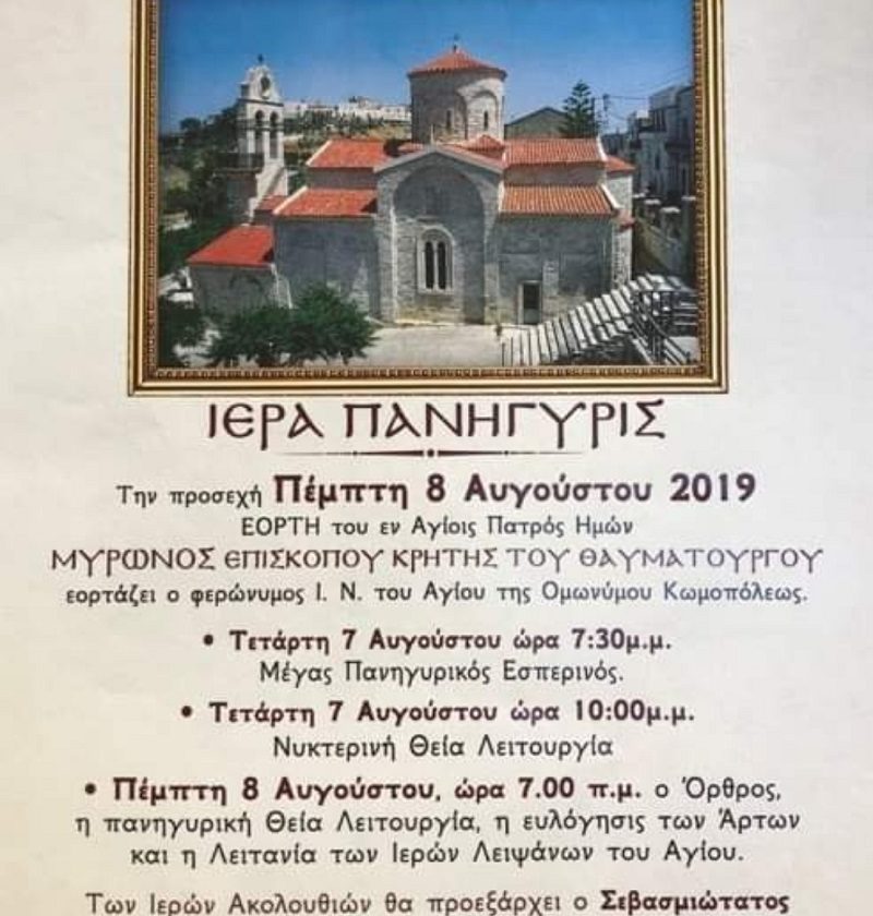 Τον πολιούχο και προστάτη της Άγιο Μύρωνα η μνήμη του οποίου τιμάται στις 8 Αυγούστου  θα γιορτάσει και φέτος η ομώνυμη κωμόπολη στο Ηρακλειο, με λαμπρότητα και κατάνυξη .