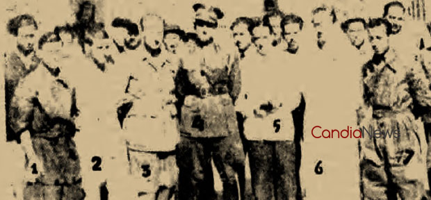 Και αναμνηστική φωτογραφία με τους πρώτους Ιταλούς που πιάστηκαν αιχμάλωτοι στον ελληνικό χώρο. Από αριστερά, Ανδρέα Ράια, ο λοχίας μηχανικός Ντελαβάλλε, ο Φιορέττι, ο υποδιοικητής της χωροφυλακής Μεσαράς Μίχας, ο δημοσιογράφος Γ. Λυδίας, ο υποσμηναγός Τορέλλι και ο λοχίας ασυρματιστής Φιλορέτε