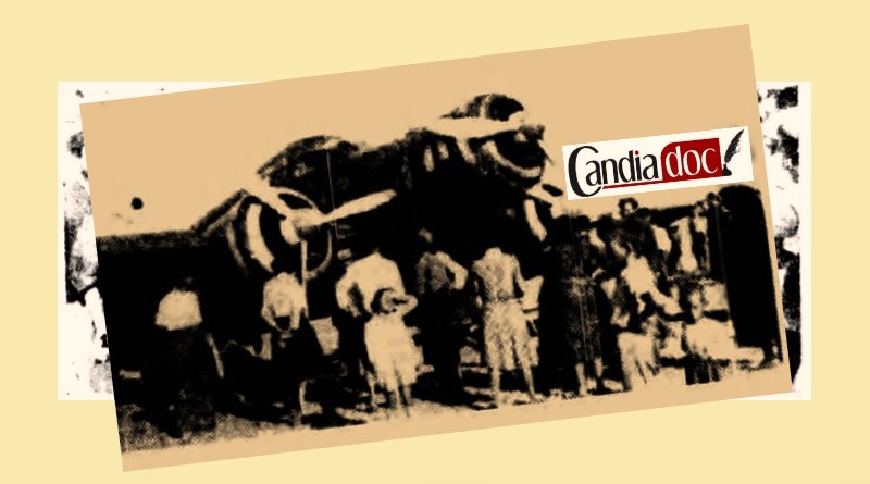 Η λεζάντα που συνόδευε τη δημοσίευση της φωτογραφίας στο «Ελληνικόν Μέλλον»: «Το πρώτον επί Ελληνικου έδάφους καταρριφθέν υπό των Άγγλων ιταλικόν βοβαρδιστικόν «Σαβόια» περιστοιχούμενον υπό των χωρικών της Μεσσαράς της Κρήτης. Η φωτογραφία ελήφθη ολίγας ώρας μετά την πτώσιν του αεροπλάνου, αι μηχαναί και το σκάφος του οποίου ήταν διάτρητα από τα αντιαεροπορικά βλήματα των Άγγλων»