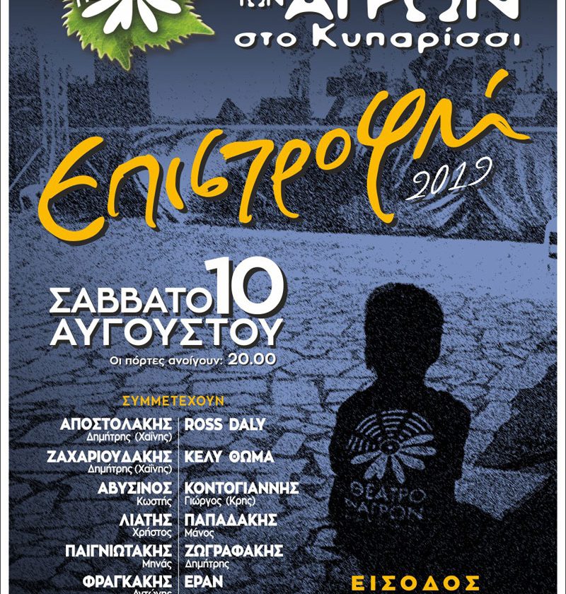 Μετά από τρία χρόνια …αγρανάπαυσης το Θέατρο των Αγρών ανοίγει και πάλι το Σάββατο 10 Αυγούστου, φιλοδοξώντας να προσθέσει από το Κυπαρίσσι τη δική του καλοκαιρινή νότα ψυχαγωγίας στα πολιτιστικά δρώμενα του Ηρακλείου.