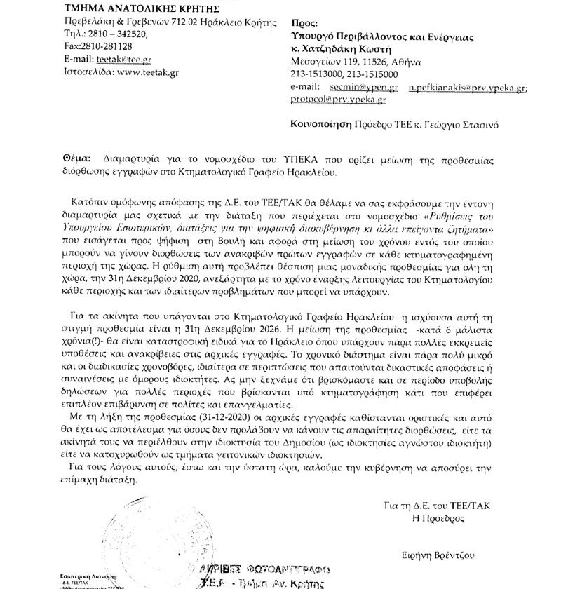 Την έντονη διαμαρτυρία του για το νομοσχέδιο του ΥΠΕΚΑ που ορίζει μείωση της προθεσμίας διόρθωσης εγγραφών στο Κτηματολογικό Γραφείο Ηρακλείου, εκφράζει μέσω επιστολής του προς τον Υπουργό Περιβάλλοντος και Ενέργειας, κ. Κώστα Χατζηδάκη, το ΤΕΕ/ΤΑΚ.