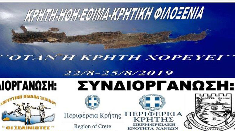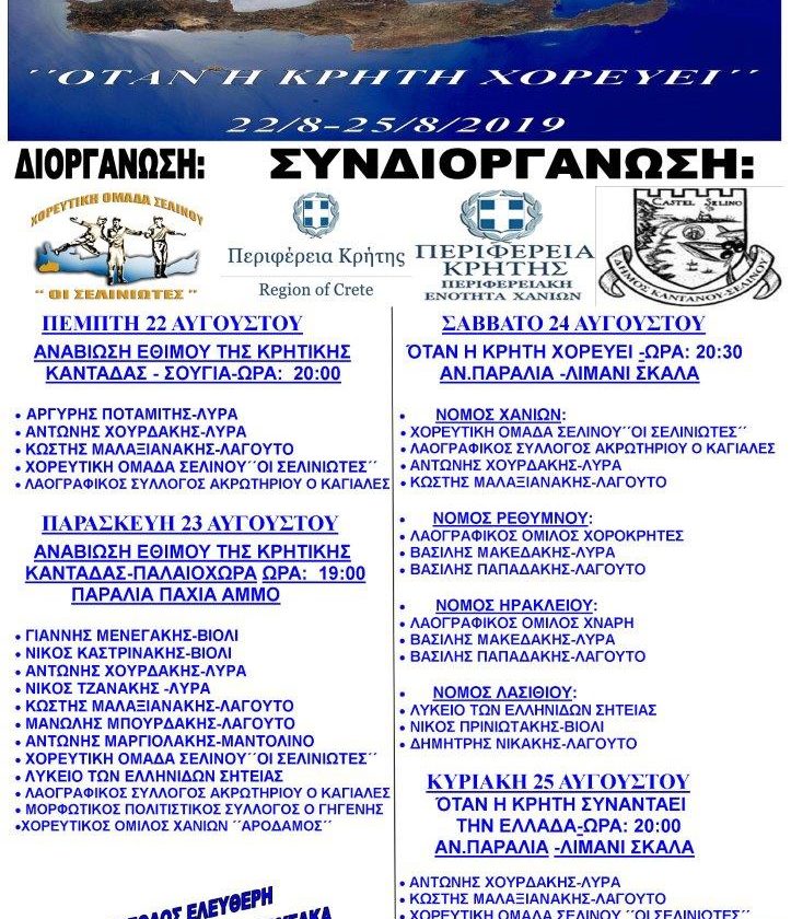 Στην συνέχεια των εκδηλώσεων το Σάββατο 24 Αυγούστου στις 9 το βράδυ θα πραγματοποιηθεί η εκδήλωση ΄΄ ΟΤΑΝ Η ΚΡΗΤΗ ΧΟΡΕΥΕΙ΄΄ στην Ανατολική παραλία της Παλαιόχωρας με την συμμετοχή χορευτικών από όλη την Κρήτη που θα παρουσιάσουν χορούς από κάθε νομό της ΚΡΗΤΗΣ.