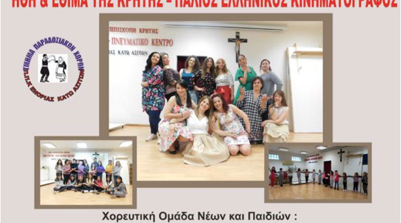 Το Πολιτιστικό Πνευματικό Κέντρο Ενορίας Κάτω Ασιτών παρουσιάζει την μουσικο-θεατρική παράσταση «Ήθη & Έθιμα της Κρήτης – Παλιός Ελληνικός Κινηματογράφος», την Κυριακή 25 Αυγούστου και ώρα 21.30 στο Ανοικτό Θέατρο «Πύλη Βηθλεέμ», στο πλαίσιο των εκδηλώσεων «Ηράκλειο -Καλοκαίρι 2019».