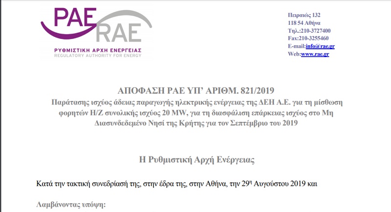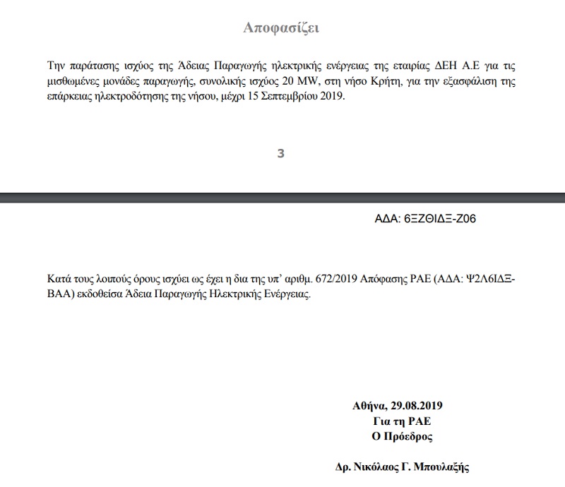 Ειδικότερα, η ΔΕΗ προχώρησε στο παραπάνω αίτημα παράτασης της άδειας παραγωγής για ισχύ 20 MW, κατόπιν εισηγήσεως του Διαχειριστή ΜΔΝ (ΔΕΔΔΗΕ). Εκεί διατυπωνόταν ότι με βάση την υφιστάμενη διαθεσιμότητα του παραγωγικού δυναμικού (677,5 MW συνολική αποδιδόμενη ισχύς των Θερμικών Μονάδων, Αύγουστος 2019) και την πρόβλεψη της αιχμής του φορτίου του ΗΣ της Κρήτης για τον Σεπτέμβριο 2019, καθίσταται αναγκαία η παράταση μίσθωσης φορητών Η/Ζ ισχύος 20MW.